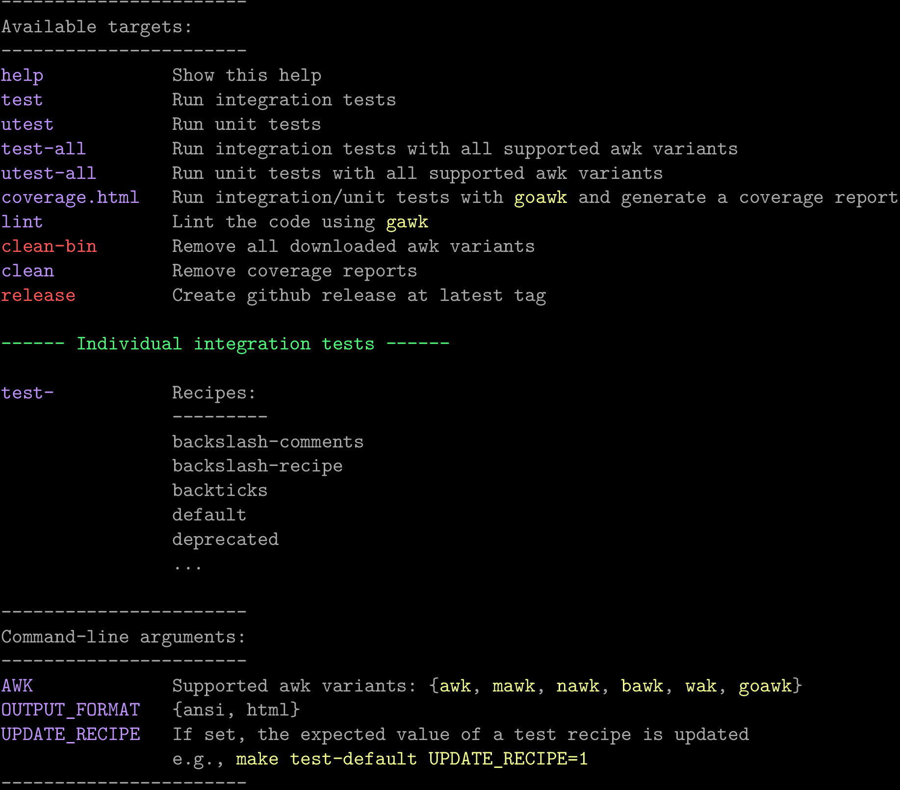 ----------------------- Available targets: ----------------------- help Show this help test Run integration tests utest Run unit tests test-all Run integration tests with all supported awk variants utest-all Run unit tests with all supported awk variants coverage.html Run integration/unit tests with goawk and generate a coverage report lint Lint the code using gawk clean-bin Remove all downloaded awk variants clean Remove coverage reports release Create github release at latest tag ------ Individual integration tests ------ test- Recipes: --------- backslash-comments backslash-recipe backticks default deprecated ... ----------------------- Command-line arguments: ----------------------- AWK Supported awk variants: {awk, mawk, nawk, bawk, wak, goawk} OUTPUT_FORMAT {ansi, html} UPDATE_RECIPE If set, the expected value of a test recipe is updated e.g., make test-default UPDATE_RECIPE=1 -----------------------